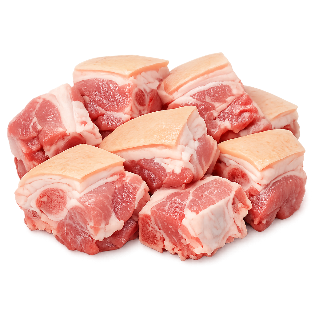 Pork Thai cut with skin is a traditional-style pork portion, usually chopped into medium-sized pieces with bone and skin intact. The skin and natural fat enhance flavor and keep the meat moist during cooking. It is commonly used in curries, stir-fries, and slow-cooked dishes, where the skin adds richness and a slightly chewy texture while the meat remains tender and juicy.